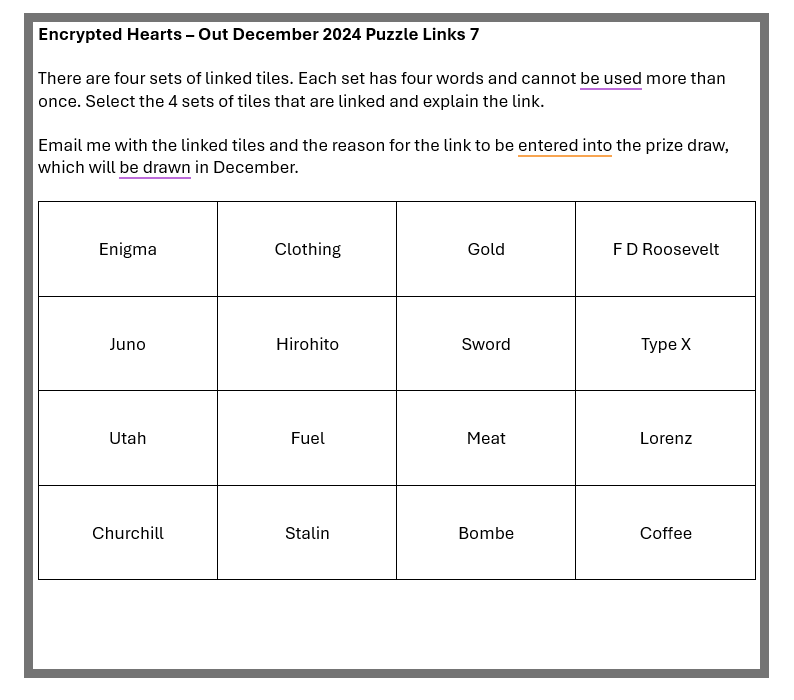 Please email me with the completed 4 sets of 4 linked words and why they are linked, to be entered into the prize draw, to be drawn in December. Enjoy!