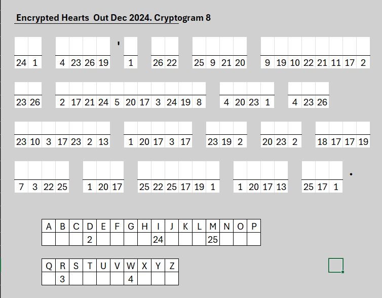 Encrypted Hearts – puzzle 8 – Cryptogram Please email me with the completed sentence to be entered into the prize draw, to be drawn in December. Enjoy! Share this: Click to share on X (Opens in new window) X Click to share on Facebook (Opens in new window) Facebook Like Loading...