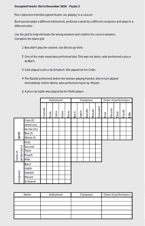 Five characters from Encrypted Hearts are playing in a concert. Each person plays a different instrument, performs a work by a different composer and plays in a different order. Using the clues below work out who played which instrument, by which composer and in which order.